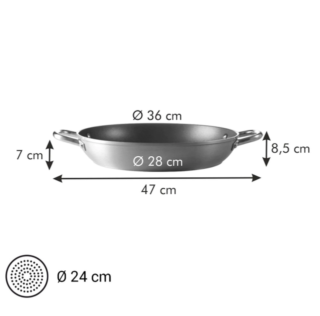Ampio tegame perfetto per preparare grandi quantità di cibo sui fornelli e al forno. Provvisto di un rivestimento antiaderente di alta qualità, di 2 solide impugnature e fondo per induzione in acciaio inossidabile. Adatto a tutti i tipi di piano cottura: elettrico, a gas, in vetroceramica e a induzione. Garanzia 5 anni.
